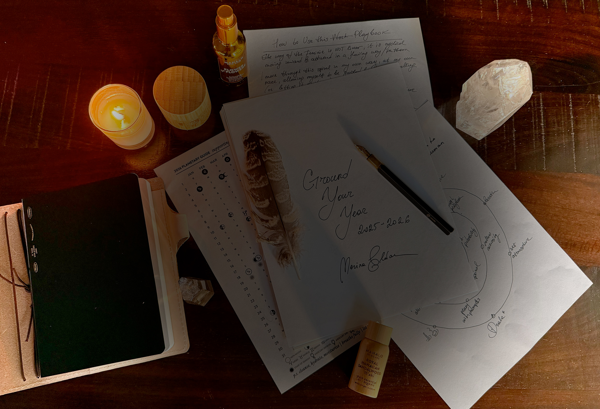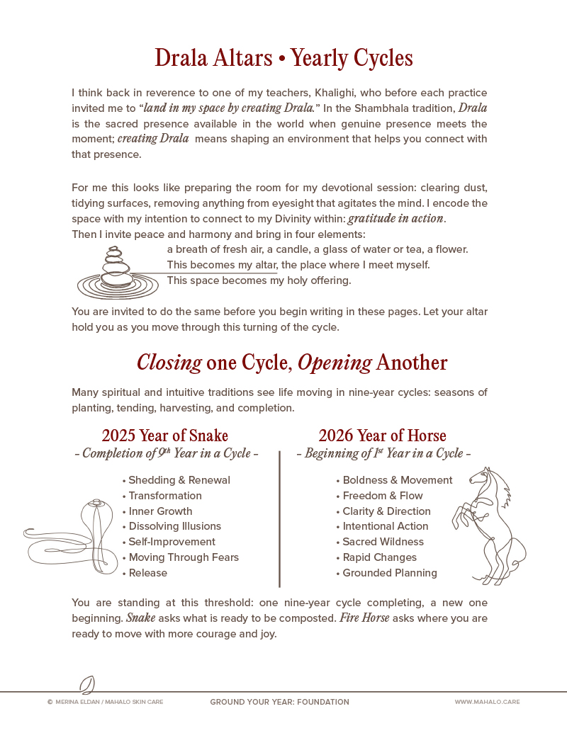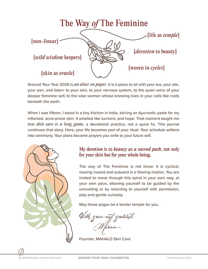 Born from Merina’s yearly reflections, zeal for journaling, devotion to embodiment, passion for skincare, and dedication to creating a meaningful, fulfilling life. Ground Your Year is a guided workbook, structured in a playful way that walks you through the completion of the 2025 cycle and the creation of your desired future, with the intention of experiencing your life in the most joyful way, no matter what surprises come along the way.